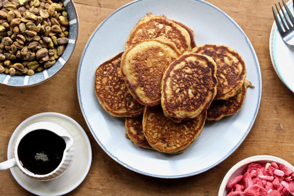 I bet you’ve never seen that combo in a pancake! And if you have, please message me immediately. 🙂 It’s a combo that works and it happens to work especially well in pancakes. Why? Well, pistachios have a slightly sweet taste and so do strawberries (freeze-dried). Too much sweet is a problem, but since they’re both subtly sweet, it’s perfection. Plus, turning the pistachios into “flour” makes even the biggest doubter re-consider these pancakes!
